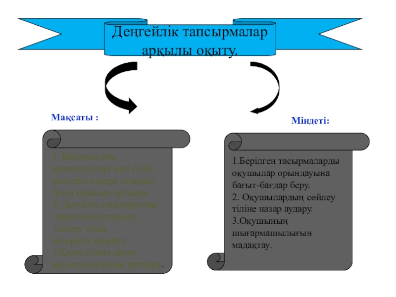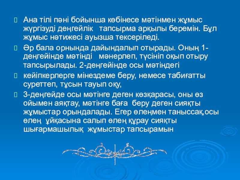 ана тілі, қазақ тілі, дүниетану пәндері бойынша деңгейлік тапсырмалар беріп 1,2,3,4 деңгейде беріледі.