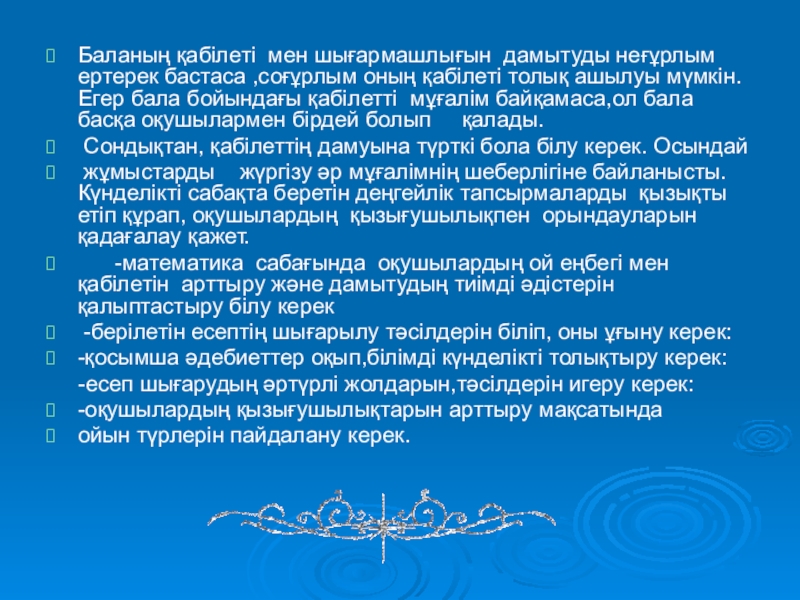 Слайд 9 Оқушылардың шығармашылығын арттыруда 2-сыныптан бастап математика,