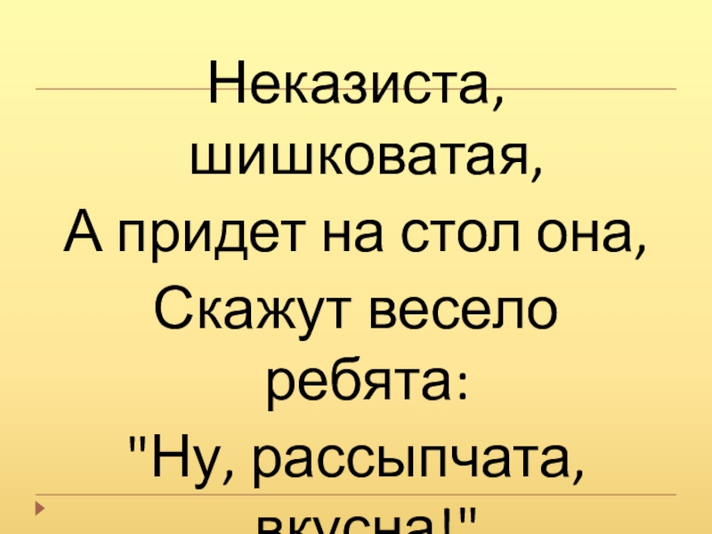 Неказиста, шишковатая,А придет на стол она,Скажут весело ребята: