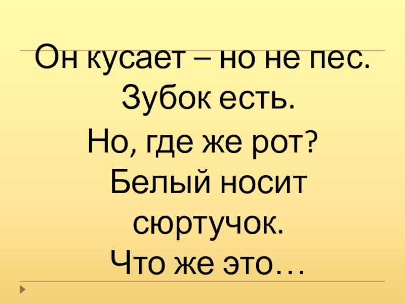 Он кусает – но не пес. Зубок есть. Но, где же рот? Белый носит сюртучок. Что же