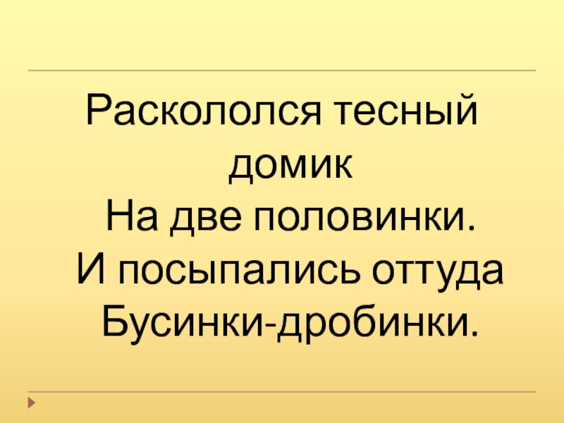 Раскололся тесный домик На две половинки. И посыпались оттуда Бусинки-дробинки.
