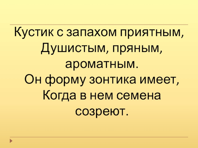 Кустик с запахом приятным, Душистым, пряным, ароматным. Он форму зонтика имеет, Когда в нем семена созреют.