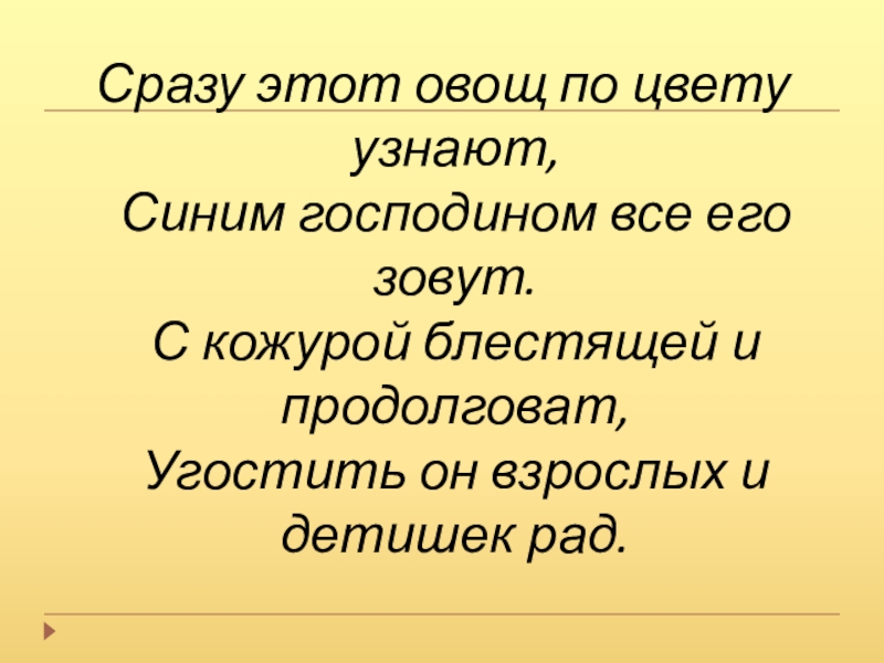 Сразу этот овощ по цвету узнают, Синим господином все его зовут. С кожурой