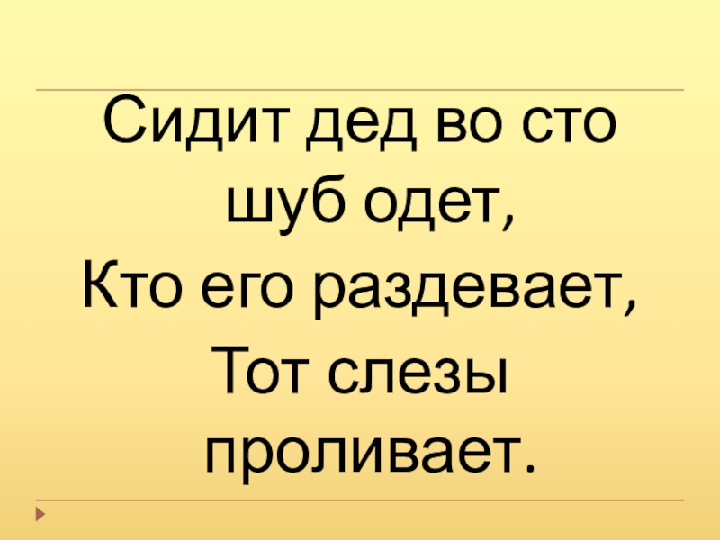 Сидит дед во сто шуб одет,Кто его раздевает,Тот слезы проливает.