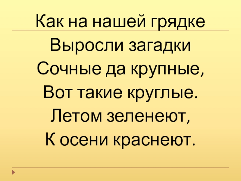 Как на нашей грядкеВыросли загадкиСочные да крупные,Вот такие круглые.Летом зеленеют,К осени краснеют.