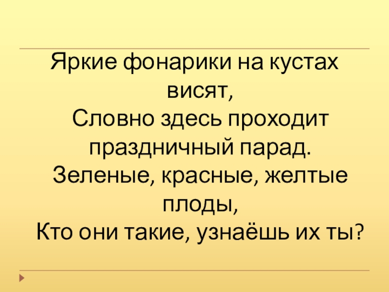 Яркие фонарики на кустах висят, Словно здесь проходит праздничный парад. Зеленые, красные, желтые плоды, Кто они такие,