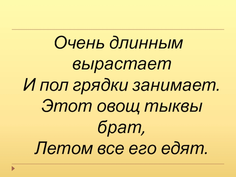 Очень длинным вырастает И пол грядки занимает. Этот овощ тыквы брат, Летом все его едят.