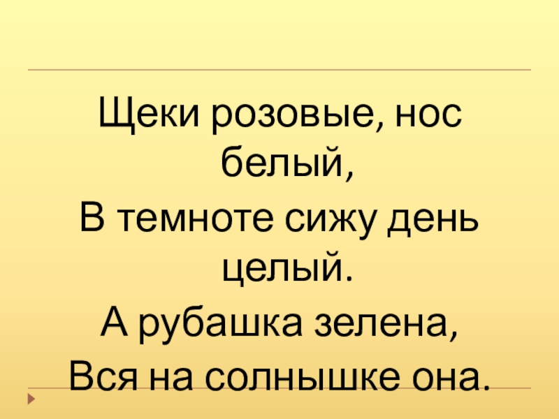 Щеки розовые, нос белый,В темноте сижу день целый.А рубашка зелена,Вся на солнышке она.