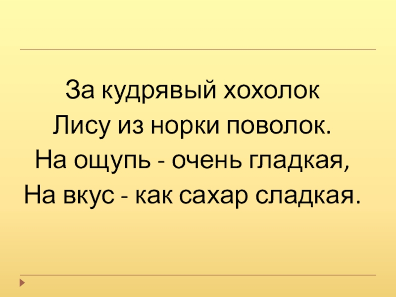 За кудрявый хохолокЛису из норки поволок.На ощупь - очень гладкая,На вкус - как сахар сладкая.