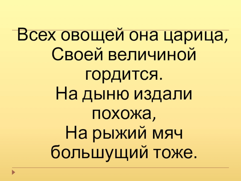 Всех овощей она царица, Своей величиной гордится. На дыню издали похожа, На рыжий мяч большущий тоже.