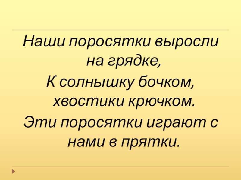 Наши поросятки выросли на грядке,К солнышку бочком, хвостики крючком.Эти поросятки играют с нами в прятки.