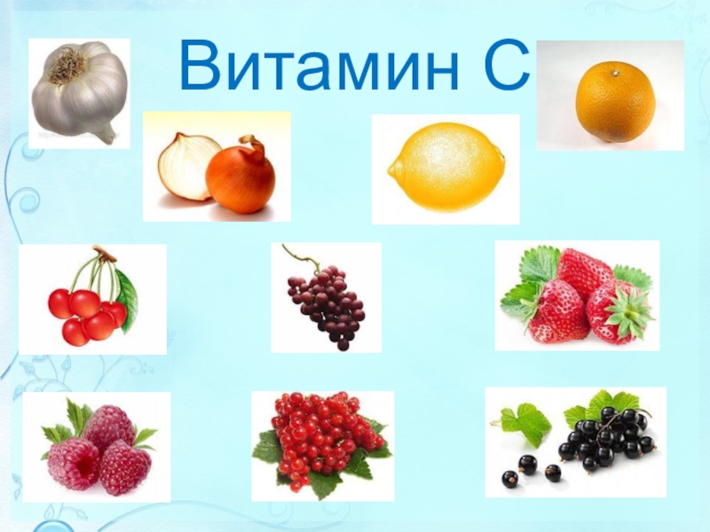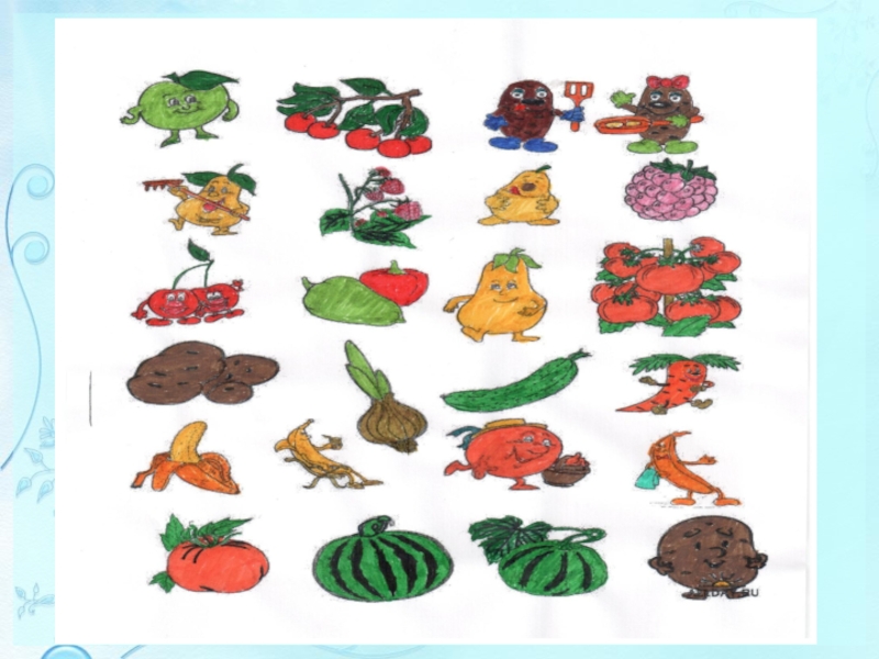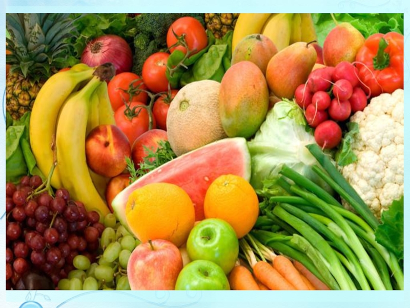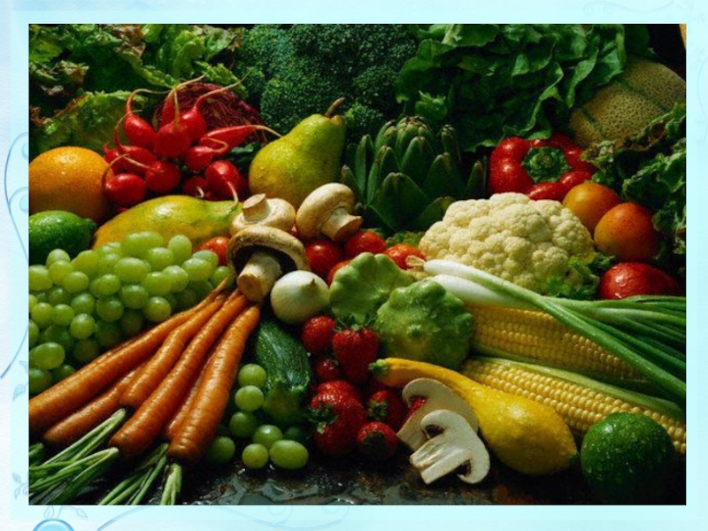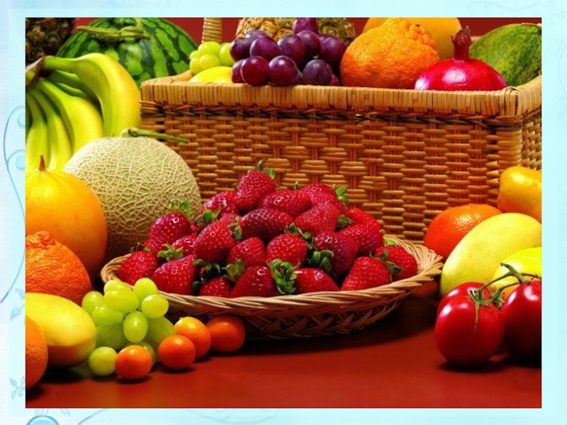 Слайд 1Овощи, ягоды, фрукты – витаминные продукты.