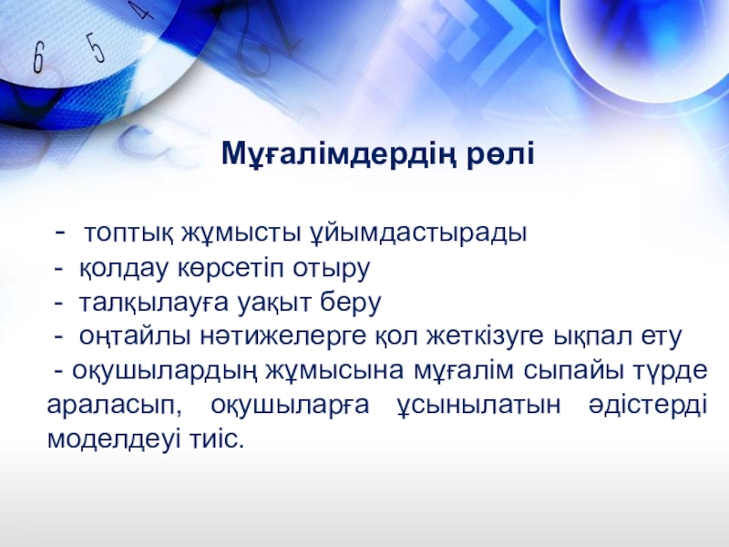 Мұғалімдердің рөлі - топтық жұмысты ұйымдастырады - қолдау көрсетіп отыру - талқылауға уақыт беру - оңтайлы нәтижелерге