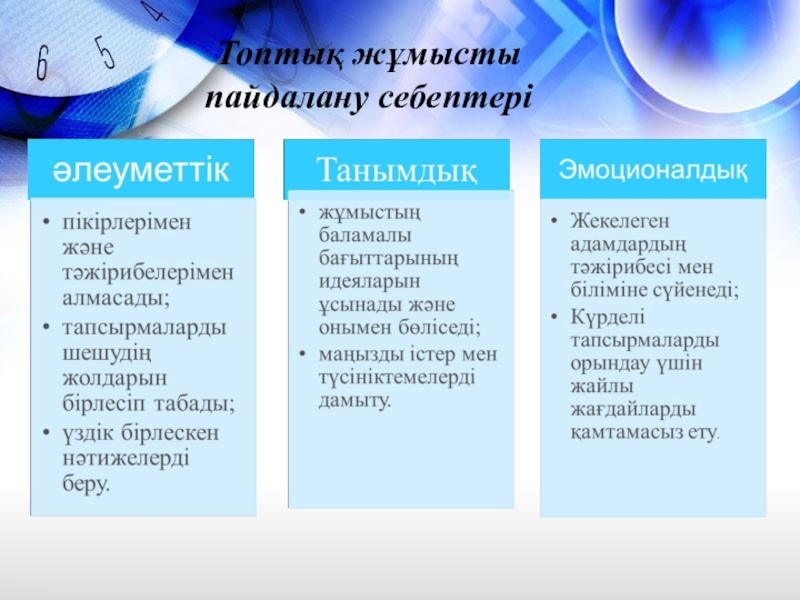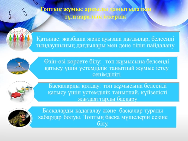 Слайд 4Топтық жұмыс арқылы дамытылатын тұлғааралық іскерлік