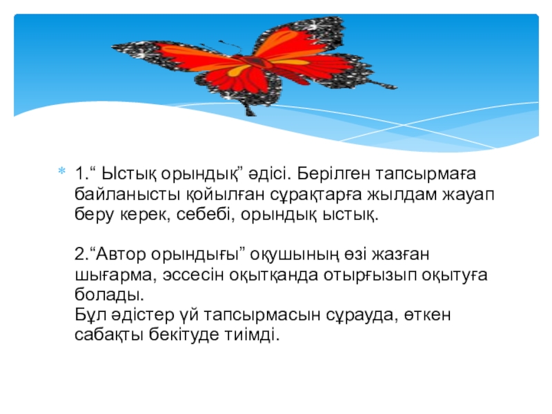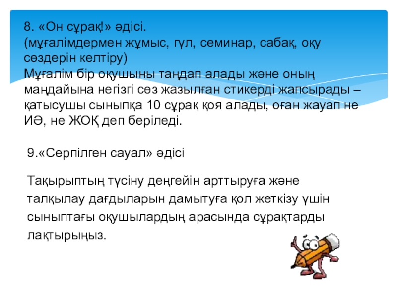 Мұғалім бір оқушыны таңдап алады және оның маңдайына негізгі сөз жазылған стикерді жапсырады – қатысушы сыныпқа 10 сұрақ қоя алады, оған жауап не ИӘ, не ЖОҚ деп беріледі.