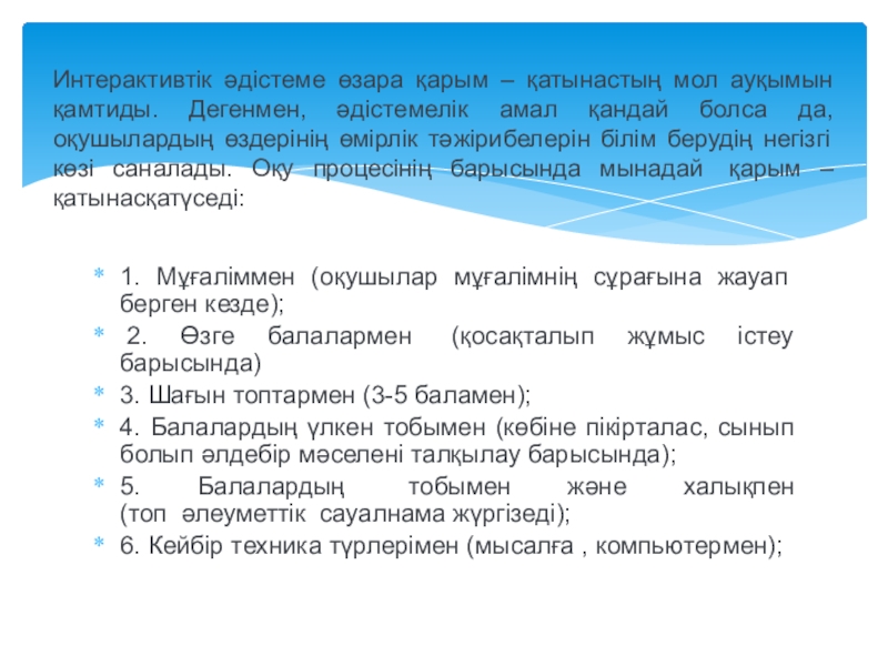 Интерактивтік әдістеме өзара қарым – қатынастың мол ауқымын қамтиды. Дегенмен, әдістемелік амал қандай болса да, оқушылардың өздерінің өмірлік тәжірибелерін білім берудің негізгі көзі саналады. Оқу процесінің барысында мынадай қарым – қатынасқатүседі: