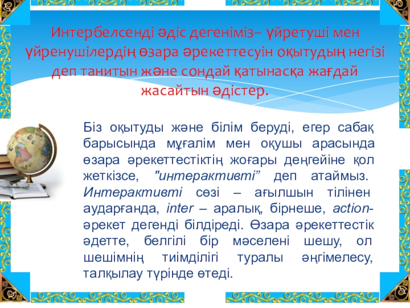 Интербелсенді әдіс дегеніміз– үйретуші мен үйренушілердің өзара әрекеттесуін оқытудың негізі деп танитын және сондай қатынасқа жағдай жасайтын әдістер.