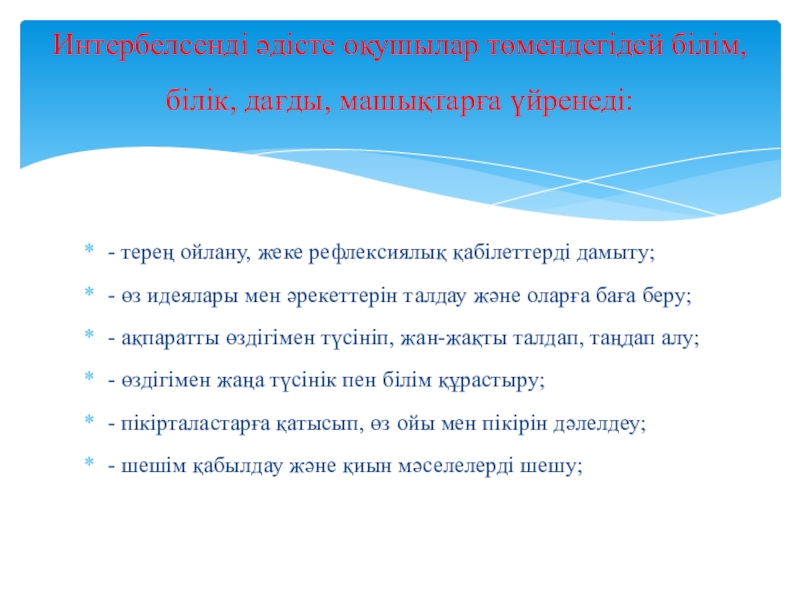 Интербелсенді әдісте оқушылар төмендегідей білім, білік, дағды, машықтарға үйренеді: