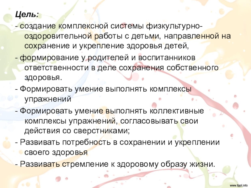 - создание комплексной системы физкультурно-оздоровительной работы с детьми, направленной на сохранение