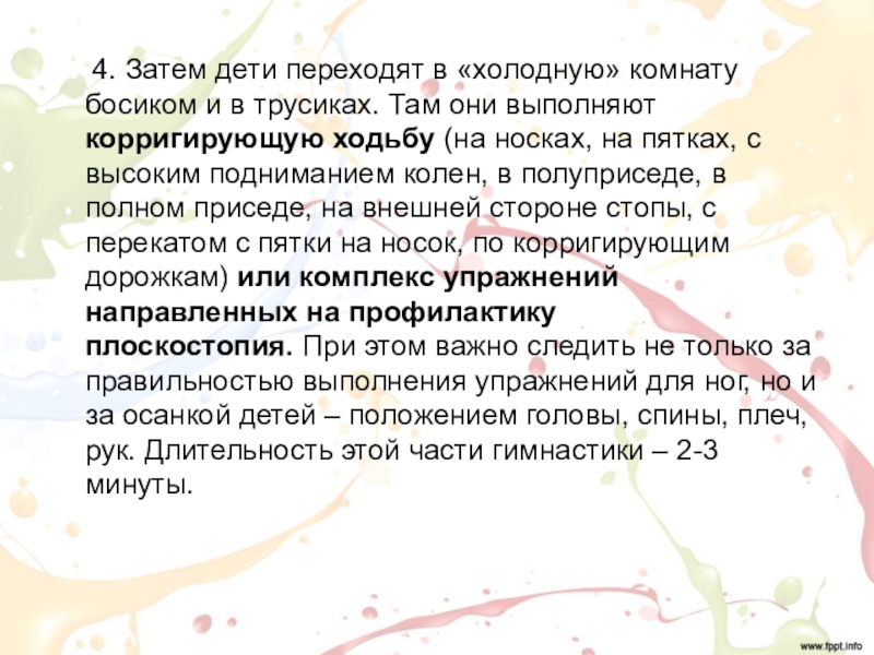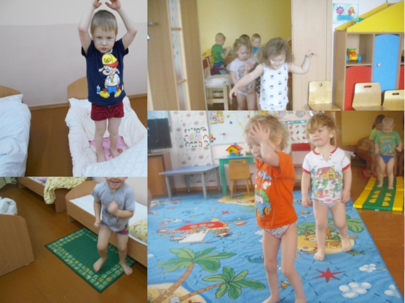 и в трусиках. Там они выполняют корригирующую ходьбу (на носках, на пятках, с высоким подниманием колен, в полуприседе, в полном приседе, на внешней стороне стопы, с перекатом с пятки на носок, по корригирующим дорожкам) или комплекс упражнений направленных на профилактику плоскостопия. При этом важно следить не только за правильностью выполнения упражнений для ног, но и за осанкой детей – положением головы, спины, плеч, рук. Длительность этой части гимнастики – 2-3 минуты.