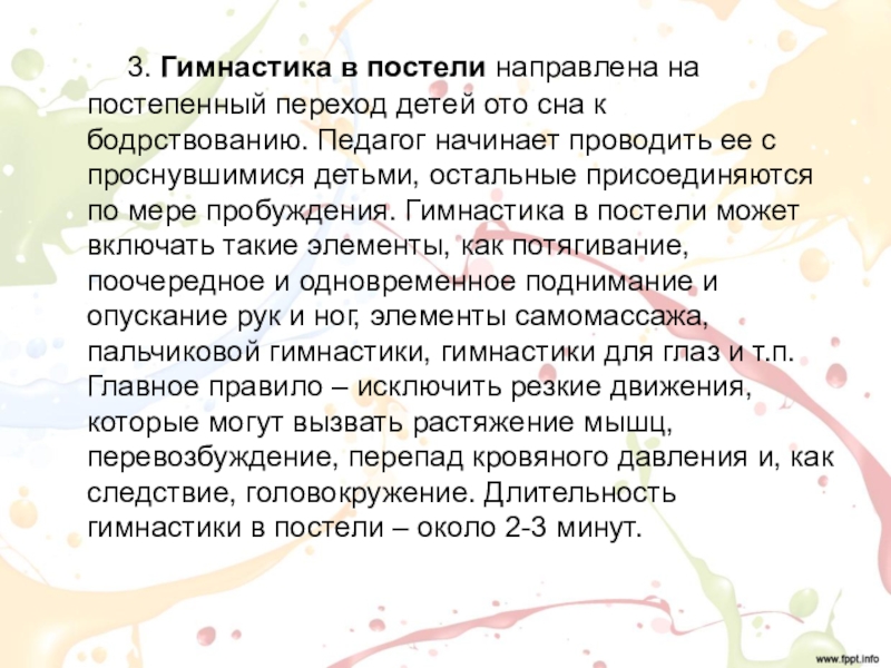 Слайд 9 3. Гимнастика в постели направлена на постепенный переход детей ото сна к
