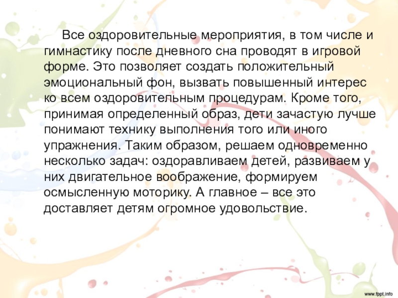 сна проводят в игровой форме. Это позволяет создать положительный эмоциональный фон, вызвать повышенный интерес ко всем оздоровительным процедурам. Кроме того, принимая определенный образ, дети зачастую лучше понимают технику выполнения того или иного упражнения. Таким образом, решаем одновременно несколько задач: оздоравливаем детей, развиваем у них двигательное воображение, формируем осмысленную моторику. А главное – все это доставляет детям огромное удовольствие.