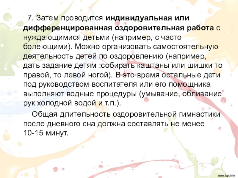 Слайд 17 7. Затем проводится индивидуальная или дифференцированная оздоровительная работа с нуждающимися детьми
