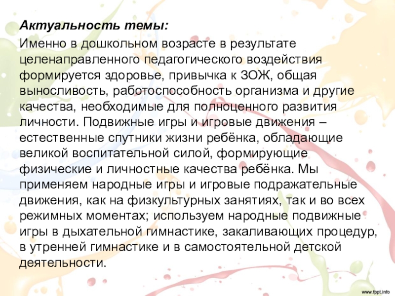 здоровье, привычка к ЗОЖ, общая выносливость, работоспособность организма и другие качества, необходимые для полноценного развития личности. Подвижные игры и игровые движения – естественные спутники жизни ребёнка, обладающие великой воспитательной силой, формирующие физические и личностные качества ребёнка. Мы применяем народные игры и игровые подражательные движения, как на физкультурных занятиях, так и во всех режимных моментах; используем народные подвижные игры в дыхательной гимнастике, закаливающих процедур, в утренней гимнастике и в самостоятельной детской деятельности.