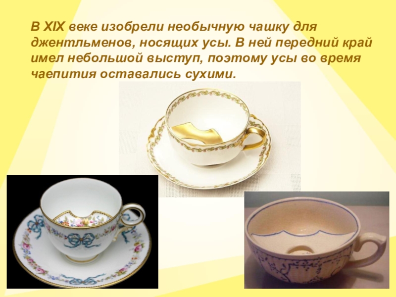 В XIX веке изобрели необычную чашку для джентльменов, носящих усы. В ней передний край имел небольшой выступ, поэтому усы во время чаепития оставались сухими.