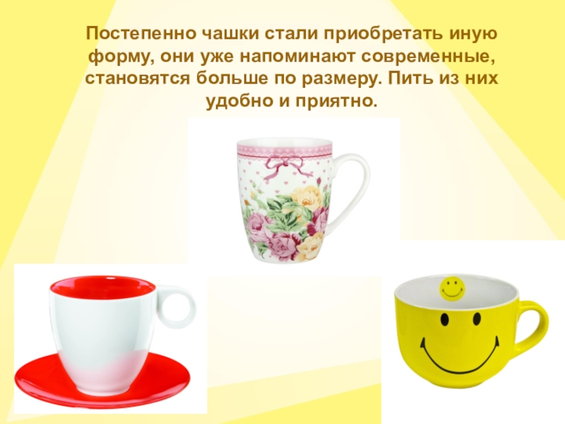 Постепенно чашки стали приобретать иную форму, они уже напоминают современные, становятся больше по размеру. Пить из них удобно и приятно.