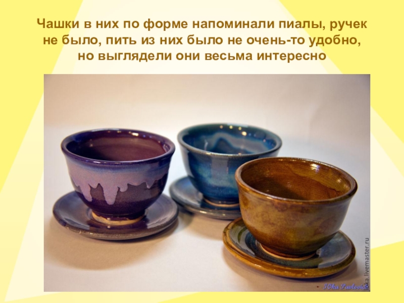 Чашки в них по форме напоминали пиалы, ручек не было, пить из них было не очень-то удобно, но выглядели они весьма интересно