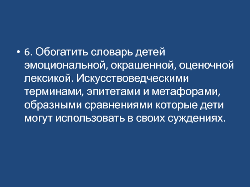6. Обогатить словарь детей эмоциональной, окрашенной, оценочной лексикой. Искусствоведческими терминами, эпитетами