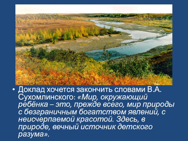Доклад хочется закончить словами В.А.Сухомлинского: «Мир, окружающий ребёнка – это, прежде