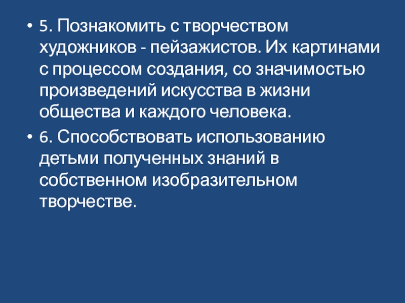 5. Познакомить с творчеством художников - пейзажистов. Их картинами с процессом