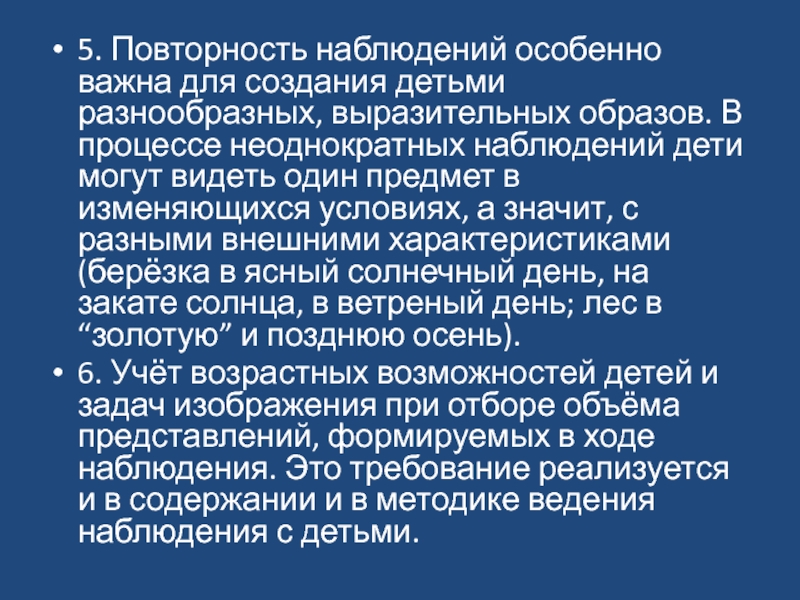 6. Учёт возрастных возможностей детей и задач изображения при отборе объёма представлений, формируемых в ходе наблюдения. Это требование реализуется и в содержании и в методике ведения наблюдения с детьми.