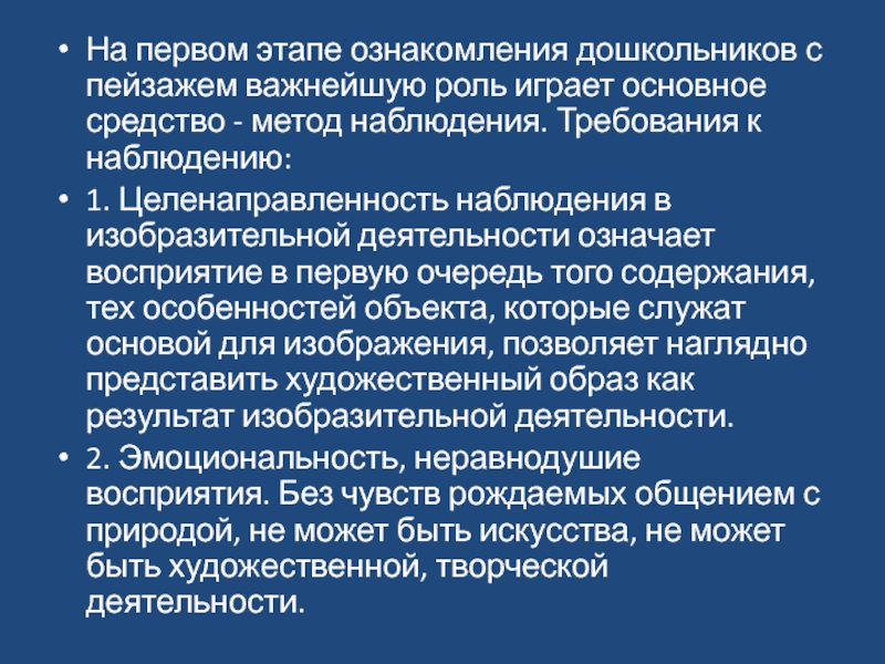 1. Целенаправленность наблюдения в изобразительной деятельности означает восприятие в первую очередь того содержания, тех особенностей объекта, которые служат основой для изображения, позволяет наглядно представить художественный образ как результат изобразительной деятельности.