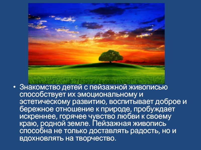 искусства. Знакомство детей с этим жанром способствует их эмоциональному и эстетическому развитию, воспитывает доброе и бережное отношение к природе, её красоте, пробуждает искреннее, горячее чувство любви к своему краю, родной земле. Художественный пейзаж помогает развивать эстетический вкус, образное и ассоциативное мышление, воображение, самосозерцание. Пейзажная живопись не только доставляет радость детям, но и вдохновляет их на творчество.