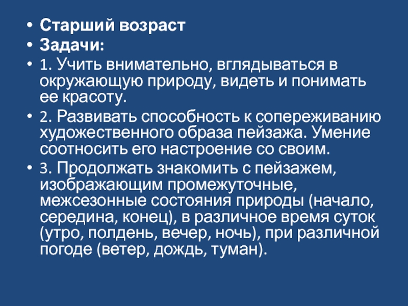 3. Продолжать знакомить с пейзажем, изображающим промежуточные, межсезонные состояния природы (начало, середина, конец), в различное время суток (утро, полдень, вечер, ночь), при различной погоде (ветер, дождь, туман).