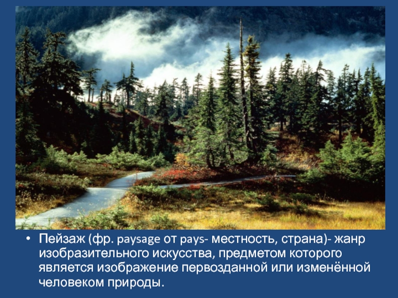 Пейзаж (фр. paysage от pays- местность, страна)- жанр изобразительного искусства, предметом