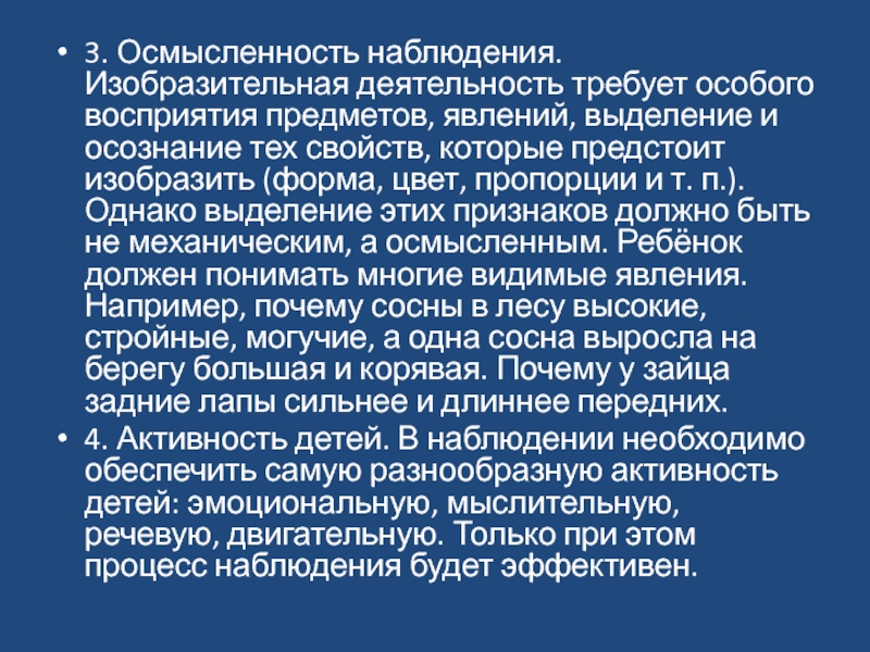 и осознание тех свойств, которые предстоит изобразить (форма, цвет, пропорции и т. п.). Однако выделение этих признаков должно быть не механическим, а осмысленным. Ребёнок должен понимать многие видимые явления. Например, почему сосны в лесу высокие, стройные, могучие, а одна сосна выросла на берегу большая и корявая. Почему у зайца задние лапы сильнее и длиннее передних.