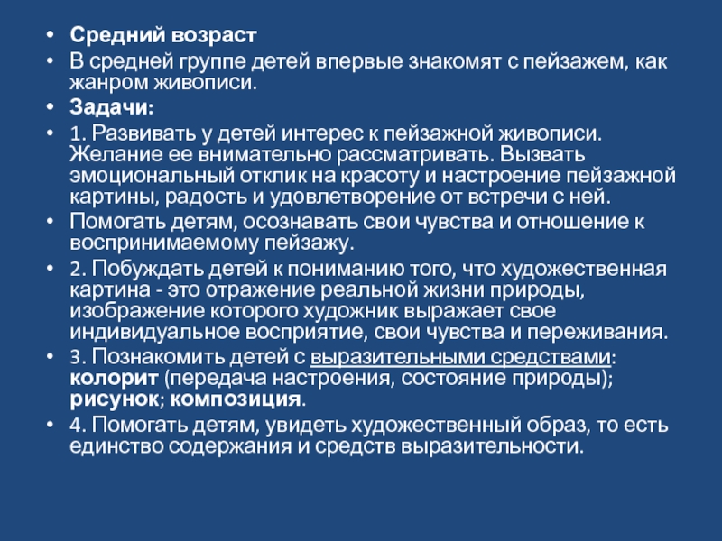 3. Познакомить детей с выразительными средствами: колорит (передача настроения, состояние природы); рисунок; композиция.