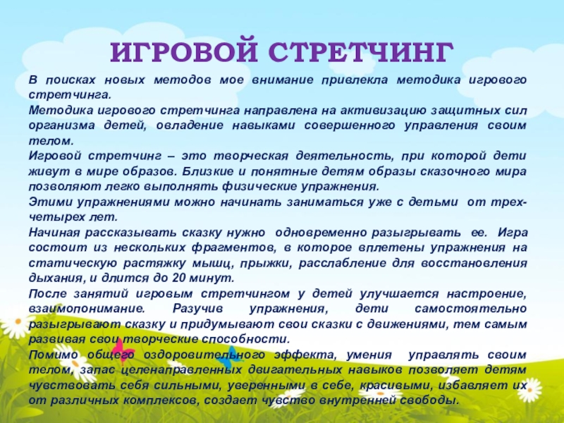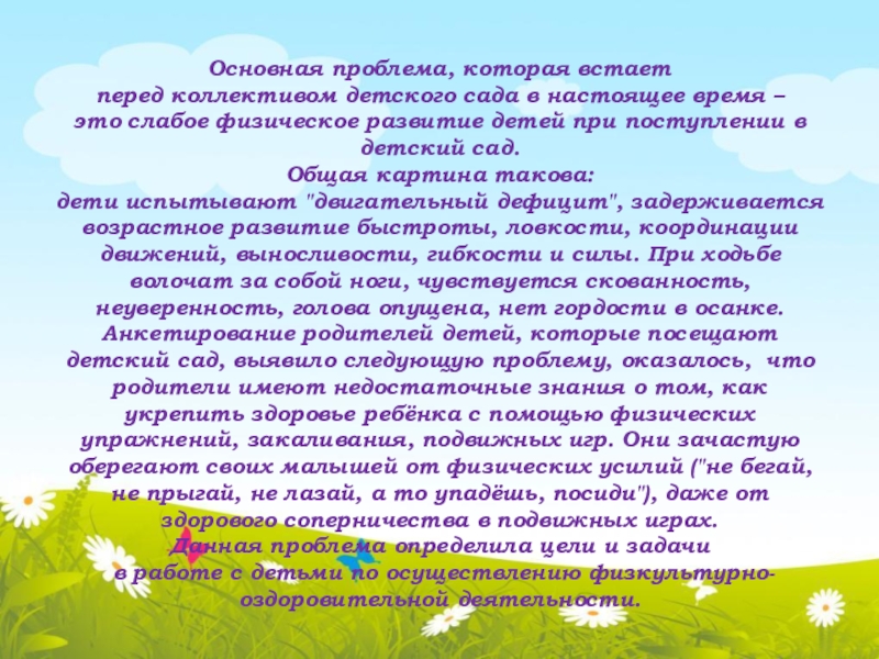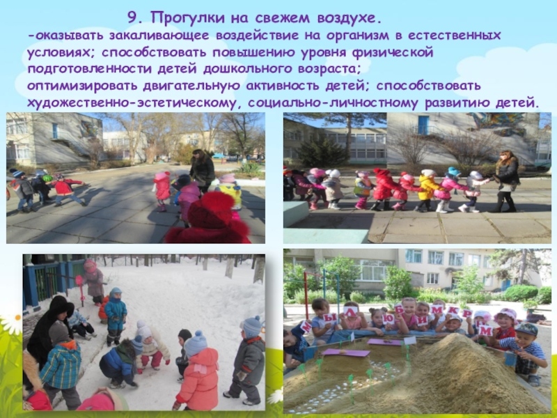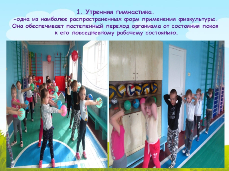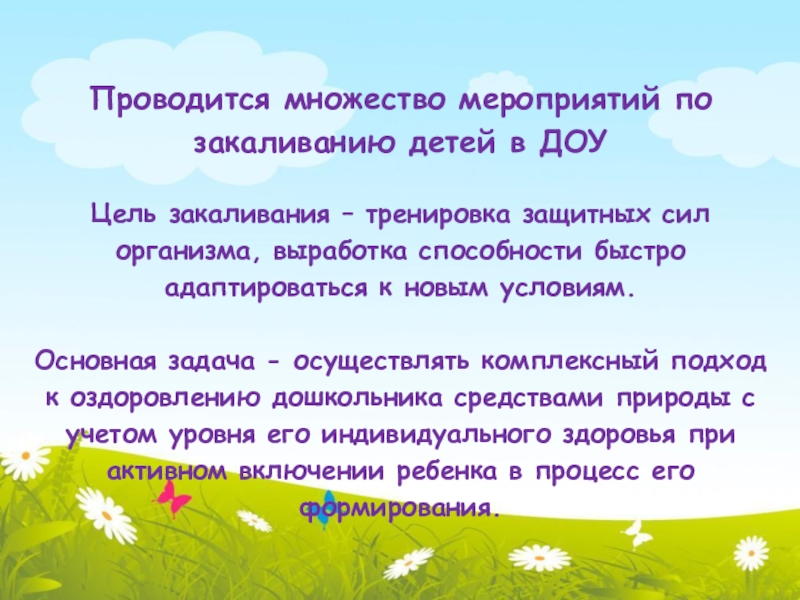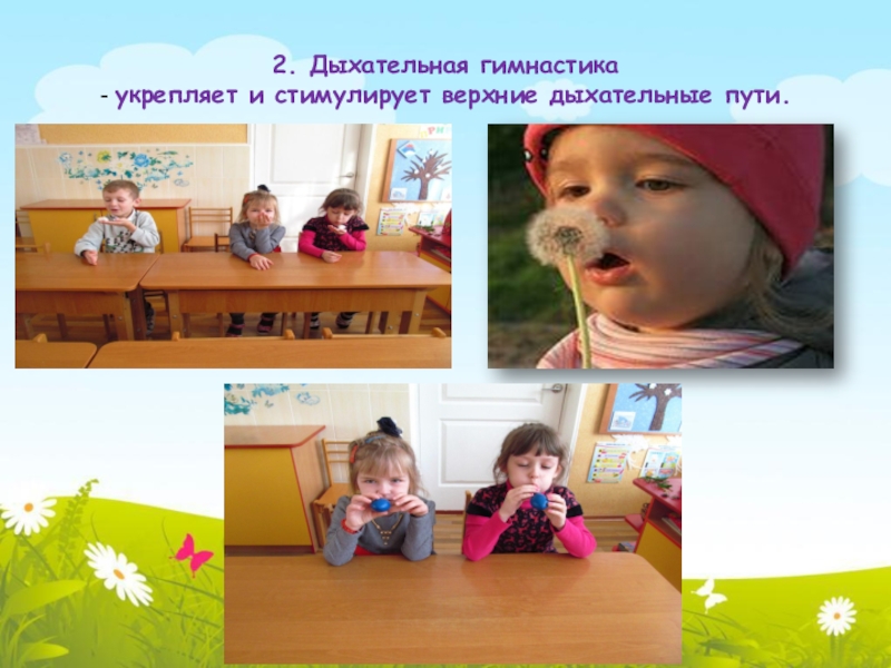 совершенствование функций организма, повышение его защитных свойств и устойчивости к заболеваниям средствами движения, дыхательной гимнастики, закаливания, гигиенических навыков.