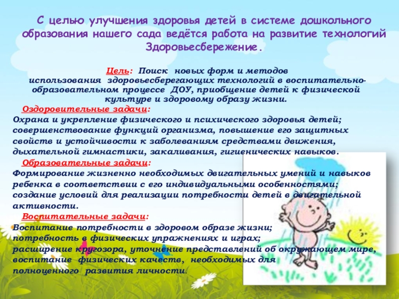использования здоровьесберегающих технологий в воспитательно-образовательном процессе ДОУ, приобщение детей к физической культуре и здоровому образу жизни.