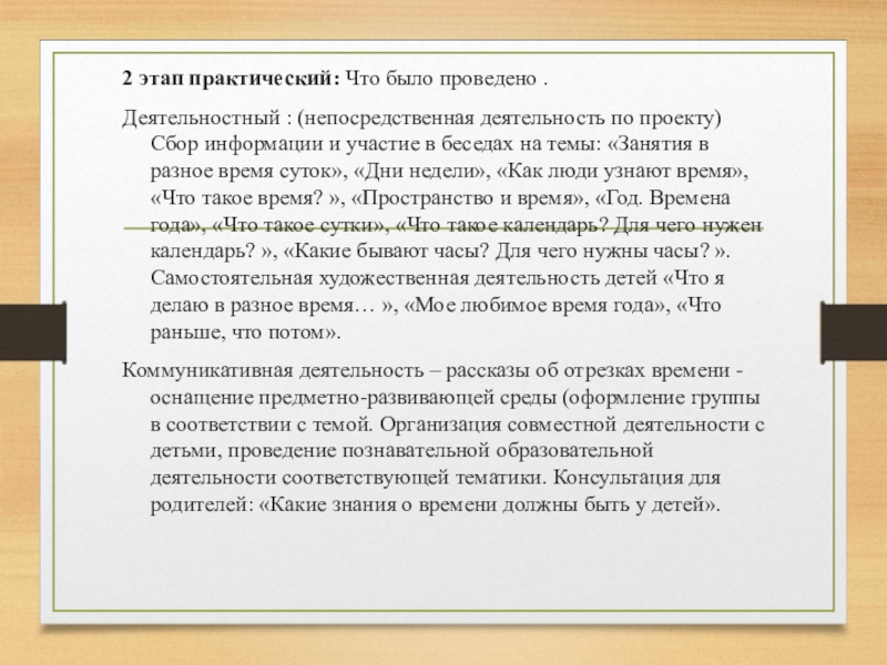по проекту) Сбор информации и участие в беседах на темы: «Занятия в разное время суток», «Дни недели», «Как люди узнают время», «Что такое время? », «Пространство и время», «Год. Времена года», «Что такое сутки», «Что такое календарь? Для чего нужен календарь? », «Какие бывают часы? Для чего нужны часы? ». Самостоятельная художественная деятельность детей «Что я делаю в разное время… », «Мое любимое время года», «Что раньше, что потом».