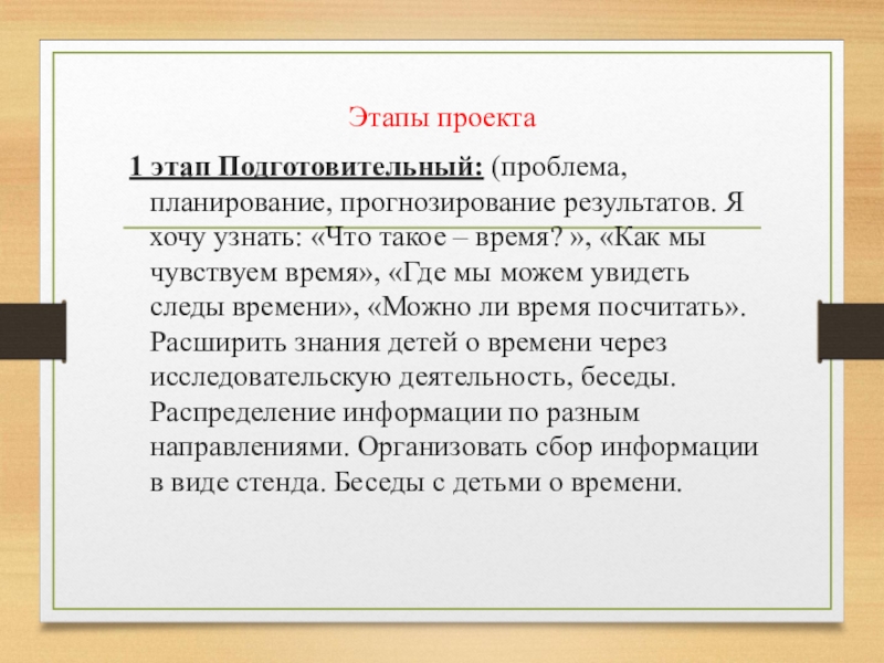 хочу узнать: «Что такое – время? », «Как мы чувствуем время», «Где мы можем увидеть следы времени», «Можно ли время посчитать». Расширить знания детей о времени через исследовательскую деятельность, беседы. Распределение информации по разным направлениями. Организовать сбор информации в виде стенда. Беседы с детьми о времени.