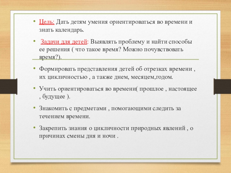Слайд 4Цель: Дать детям умения ориентироваться во времени и знать календарь.