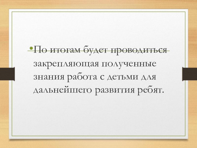 Слайд 16По итогам будет проводиться закрепляющая полученные знания работа с детьми для