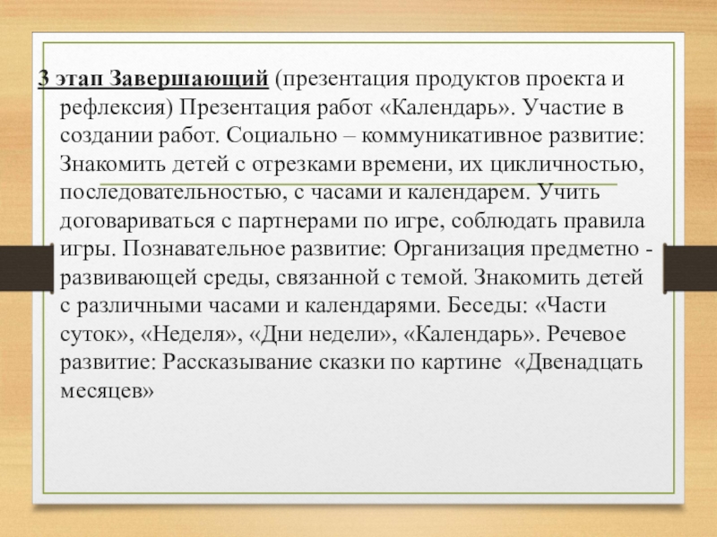 Слайд 143 этап Завершающий (презентация продуктов проекта и рефлексия) Презентация работ «Календарь».