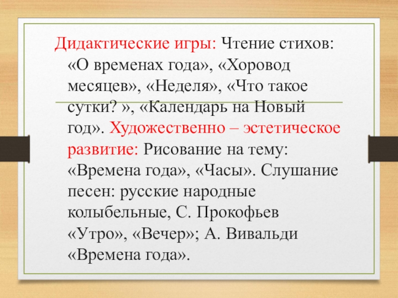 такое сутки? », «Календарь на Новый год». Художественно – эстетическое развитие: Рисование на тему: «Времена года», «Часы». Слушание песен: русские народные колыбельные, С. Прокофьев «Утро», «Вечер»; А. Вивальди «Времена года».