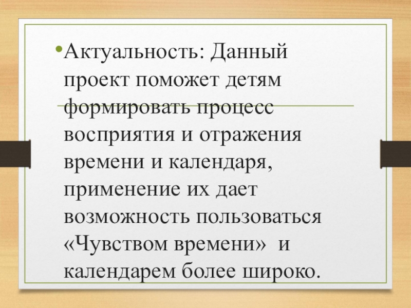 Слайд 3Актуальность: Данный проект поможет детям формировать процесс восприятия и отражения времени